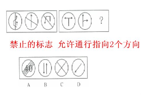 这道题属于样式类,主要考察图形的公共元素。前边3个是禁止的标志,后3个是允许通行,且指向2个方向,故选B。