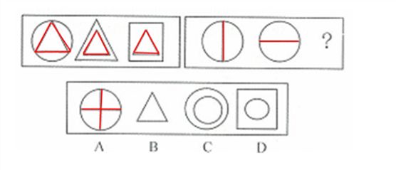 这道题属于样式类,主要考察图形的公共元素。左边一组中,各个图形含有相同的元素―三角形,且前两个图形外边数之和等于第三个图形的外边数,据此规律,右边一组中,各个图形含有相同的元素―圆,且前两个图形内部线段数之和等于第三个图形的线段数,故正确答案为A。