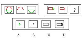 这道题属于样式类,主要考察图形的去异存同。第一组图中后面的两个图形叠加去异存同后得到第一个图形,按照这个规律,故第二组图选A。