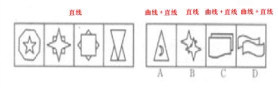这道题属于数量类,主要考察图形由哪几种线条组成:直线。题干图形均由直线构成,备选项中只有B项图形是由直线构成的,其他几项图形中都含有曲线。故正确答案为B。