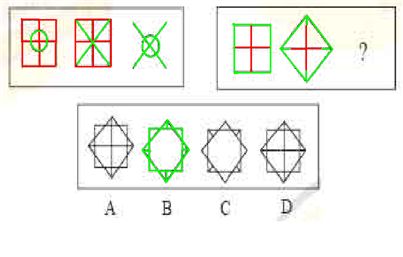 答案:B。 解析:这道题属于样式类,主要考察两个图形相同或不同部分发生的变化。通过观察,第一组图的前两个图形叠加后去掉相同的部分,留下相异的部分,就得到第三个图,按照这个规律,第二组图的第三个图形便可得到,故选B。