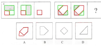 本题属于样式类,主要考察了图形样式的运算:去异存同。第一组图形中,前两个图形白色区域求同得到第三个图形,依照此规律,所以选择A选项。