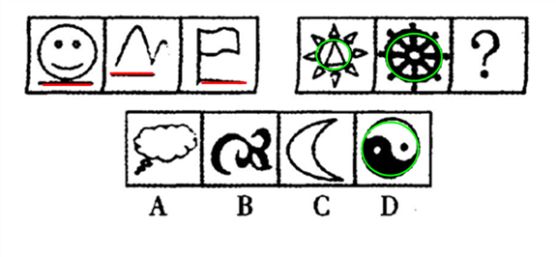 这道题属于样式类,主要考察图形的公共元素。第一组图中三个图形拥有共同的元素是横线,第二组图中三个图形拥有共同的元素圆。故选D。">