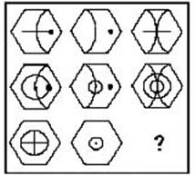 答案:B。 解析:每行的三个图形中,外面的六边形不变,第1、2个图形内部存异去同得到第3个图形。">