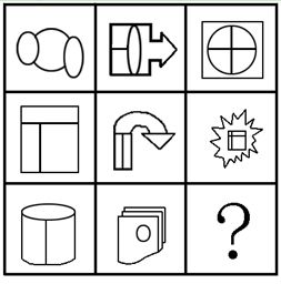 第一二行图形都是平面图形,并且都分别包含相同的元素“圆”和“矩形”;第三行图形都是立体图形,并且都包含一个相同的元素“圆”。