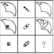 下图应有9个图形,其中缺少1个图形,请在4个备选图案中选出1个最适当的图案补上。( )