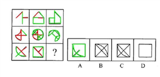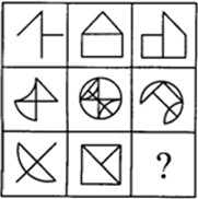 这道题属于样式类,主要考察图形的去同存异。以行为单位,将图1与图2相叠加,去同存异后得出图3。">