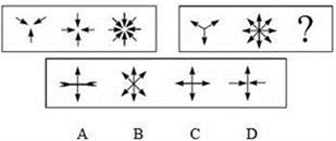 A.A B.B C.C D.D 答案:C。 解析:观察第一组图,三个图形的箭头方向一致,且总数为15。第二组图延续规律,第三个图形的箭头方向应和前两个一致,并与前两个图形的箭头总和为15。故正确答案为C。">