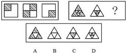 A.A B.B C.C D.D 答案:B。 解析:每组图第1个小图和第2个小图叠加,不同变空白,相同变阴影,从而形成第3个图,所以答案为B。">