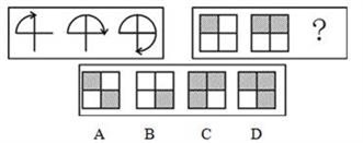 本题考查的是图形的样式问题。观察第一段的第一幅图最外侧的弧线顺时针方向增加1/4圆,得到第二幅图;第二幅图的最外侧弧线顺时针方向增加1/4圆,得到第三幅图。第二组延续这一规律,第一幅图顺时针方向增加一个小方块的阴影,得到第二幅图;第二幅图顺时针方向增加一个小方块的阴影,得到“?”处的图形,只有D符合。因此,本题答案为D选项。