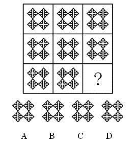 A.A B.B C.C D.D 答案:A。 解析:本题考查样式类中新运算。题干的八幅图形中,除了2×2以外,每幅图形都是由一个贯通图形和三个不贯通图形组成,所以九宫格的观看方式应该是“O”型。仔细观察可发现,1×1图中右下角为贯通图,1×2左下角为贯通图,1×3为左上为贯通图,2×3右上为贯通图,所以“?”处的贯通图形应在右下角。因此,本题答案为A选项。">