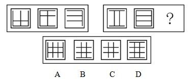 A.A B.B C.C D.D 答案:A。 解析:第一组图中,第一个图形和第二个图形去同存异得到第三个图形。要注意去同存异的范围是在四方框内,四方框并未介入到去同存异的运算中。因此,本题答案为A选项。">