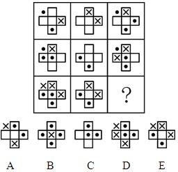 A.A B.B C.C D.D 答案:D。 解析:本题为运算类的叠加规律。通过观察九宫格的前两行我们可以发现:“ • ”+空白=“ • ”,故而排除A、B、E;“• ”+“• ”=“× ”,排除C;故而正确答案为D。">