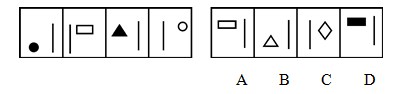 本题考查样式类的运算问题。题干中的四个图,每个图形都有2个元素,每个图都有一个相同的元素直线,并且另外一个元素的填充颜色的变化规律是阴影、白、阴影、白,是一个周期数量,延续这一规律,第五个图形应该有2个元素一条直线,另外一个是由阴影填充的元素。因此,本题答案为D选项。