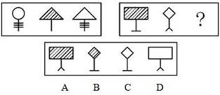 A.图A B.图B C.图C D.图D 答案:B。 解析:本题考查图形样式的渐变。第一组图中的三个图形可以各自拆成是上下两个部分,上半部分的变化规律为白、黑、白,下半部分的变化规律为第一个图为“丰”字形,第二个图变化成竖,第三个图又变回“丰”字形,间隔保持形状不变,依此规律第二组图中的变化也应该是间隔来变:上半部分为黑、白、黑,下半部分为第一个图与第三个图下半部分相同的隔变规律,因此本题答案为选B项。">