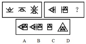 A.图A B.图B C.图C D.图D 答案:B。 解析:本题考查样式类的叠加问题。两段式的命题形式。第一段找规律:第一个图形和第二个图形叠加所得第三个图形,具体来说是这两个图形共有的横线重合,然后上下叠加形成第三个图形。第二段用规律:第一个图形和第二个图形共有的竖线重合,左右叠加形成第三个图形。故而答案是B。">