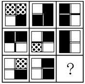 本题考查的为新运算中的黑白相加问题。此题正方形和中间的小长条按照两套规律进行叠加,正方形的横向叠加规律是:点+白=黑,点+黑=白,白+黑=黑,黑+黑=白,白+白=白;小长条的横向叠加规律是:白+黑=白,白+白=白,黑+黑=黑,按照此规律叠加后的图形为A选项。因此,本题答案为A选项。