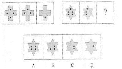 A.如图A B.如图B C.如图C D.如图D 答案:C。 解析:本题考查样式类。两段式的第一段中,第一个图形与第二个图形外部轮廓求同,内部的黑点相减得到第三个图形。因此,第二段中,第一个图形与第二个图形外部轮廓求同,内部黑点相减,得到C选项。">