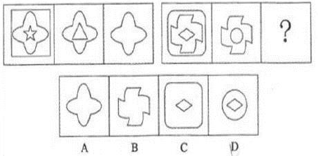 A.如图A B.如图B C.如图C D.如图D 答案:B。 解析:本题考查样式类。两段式的第一段中,第一个图形与第二个图形求同得到第三个图形。因此,第二段中,第一个图形与第二个图形求同,得到B选项。">