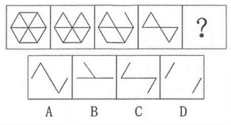 本题考查数量类。第一个图形内的所有边都是等长的,对相邻图形观察后,发现相邻图形间减少的边数分别为1、2、3条边,呈等差的规律,因此,接下来应该少4条边,所以选择D。