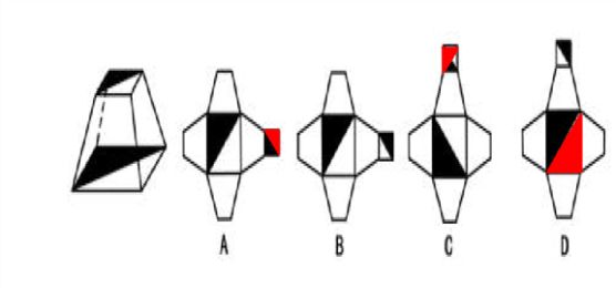 这道题属于结构类,主要考察立体图形的折叠。两个黑三角是相对关系。选B。