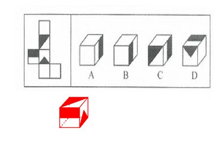 这道题属于结构类,主要考察立体图形的折叠。黑白竖条的黑边不可能接一个纯白面,白边不可能接一个黑白三角面.也不可能接一个四分之一黑三角面,据此排除B,C,.D,故选A.