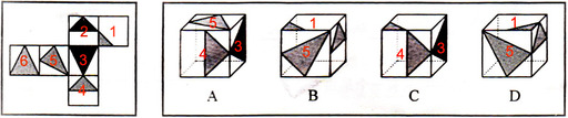 答案:A。 解析:本题考查空间重构能力,通常采用排除的思想。A项可以由左侧图形折成。如下图所示,第1面和第5面为相对面,根据相对面不相邻的原则,排除B、D。C项错误,假设左侧面和右侧面是对的,那么顶面应该是第5面而非第1面。故正确答案为A。