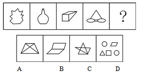 A.如上图A所示 B.如上图B所示 C.如上图C所示 D.如上图D所示 答案:C。 解析:本题考察封闭面的个数及部分数,按顺序观察每幅图的封闭面个数依次为1、2、3、4,并且每幅图的图形都是相连的,只包含一个部分,所以排除D,本题选C。">