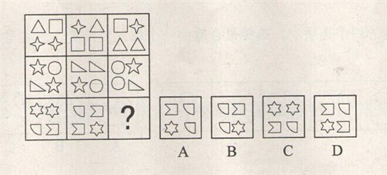 A.如上图A所示 B.如上图B所示 C.如上图C所示 D.如上图D所示 答案:A。 解析:九宫格图形横行观察可知,每一行都包含三种元素,并且每种元素个数加起来都是四个,故排除CD。其次每个图形在下一幅图中的位置与之前不一样,排除B,因此,剩下的两个扇形应该都在右边,所以答案选择A。">