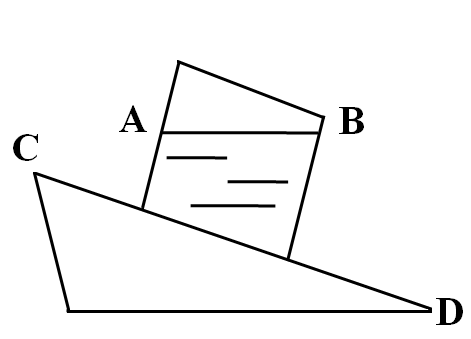 如图所示,斜面上放着一只装水的容器。容器不动的时候,水面AB是水平的;当容器从光滑斜面CD上滑下去时(不考虑摩擦力),容器里水面的情况是( )。