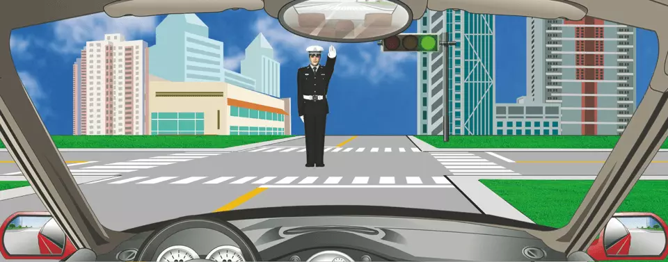 图中警察手势为停止信号,示意:不准前方车辆通行,也就是停车等待。