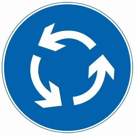 环岛行驶:表示只准车辆靠右环行。此标志设在环岛面向路口来车方向适当位置。