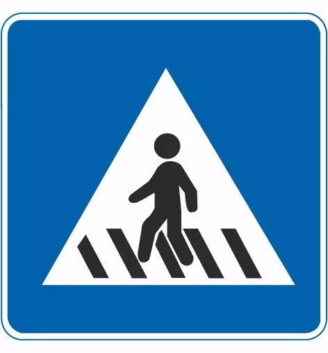此标志表示该处为人行横道。里面白色,外面蓝色正方形包围是人行横道。“注意行人”是三角形黄色框包围的!