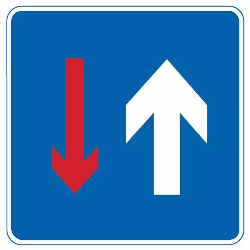 此标志表示车辆在会车时享有优先通行权利。谁粗谁先行,你的箭头比他大就会车先行,你的比他小就是会车让行。