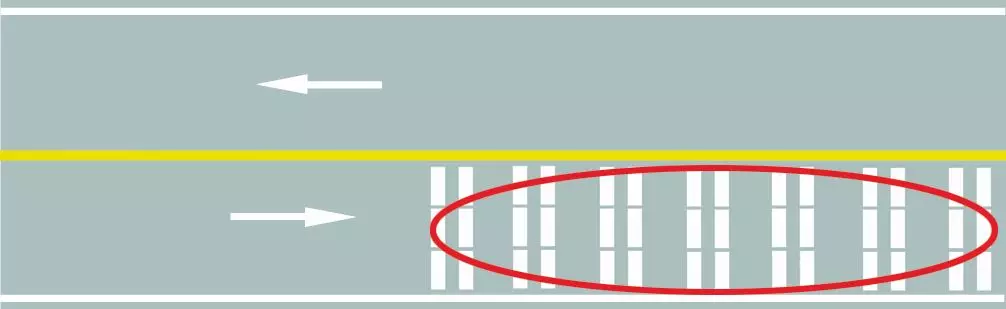 车行道减速标线设置于弯路、坡路、隧道洞口前、长下坡路段及其他需要减速的路段前或路段中的机动车行车道内,分为车行道横向减速标线和车行道纵向减速标线,可用振动标线的形式。车行道横向减速标线为一组垂直于车道中心线的白色标线。车行道纵向减速标线为一组平行于车行道分界线的菱形块虚线。