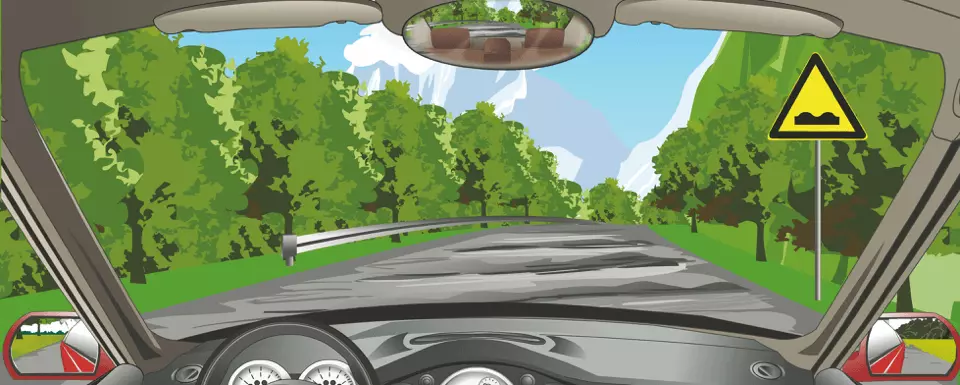 由图中交通标志可知前方是路面不平的道路,因此要减速慢行,避免颠簸等。