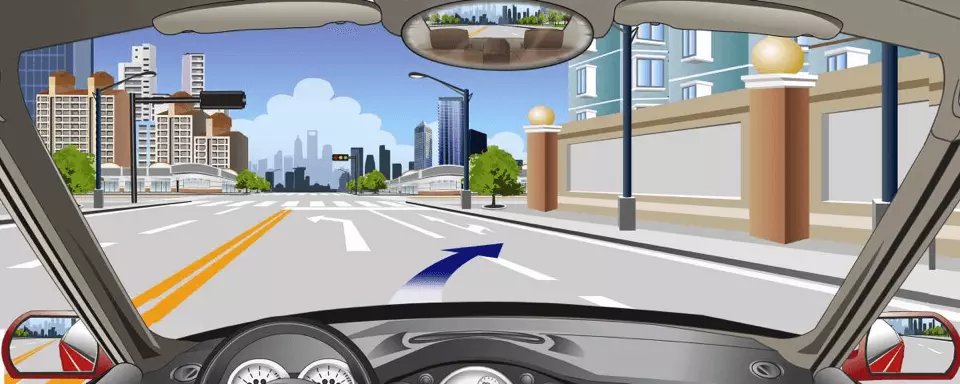 在前方交叉路口直行时,要提前在虚线区按导向箭头指示向右变更车道。