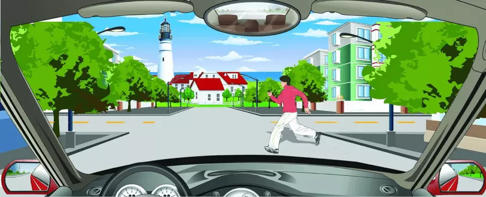 图片分析:路口遇到行人突然横穿应该减速或停车让行。