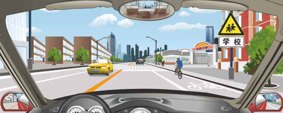 A.采取紧急制动 B.减速注意观察 C.断续鸣喇叭 D.做好绕行准备 答案:B。 解析:由图可知,前方道路是学校,要注意儿童,因此通过这样的道路时,要减速慢行,同时注意周围情况,必要时停车让行。">