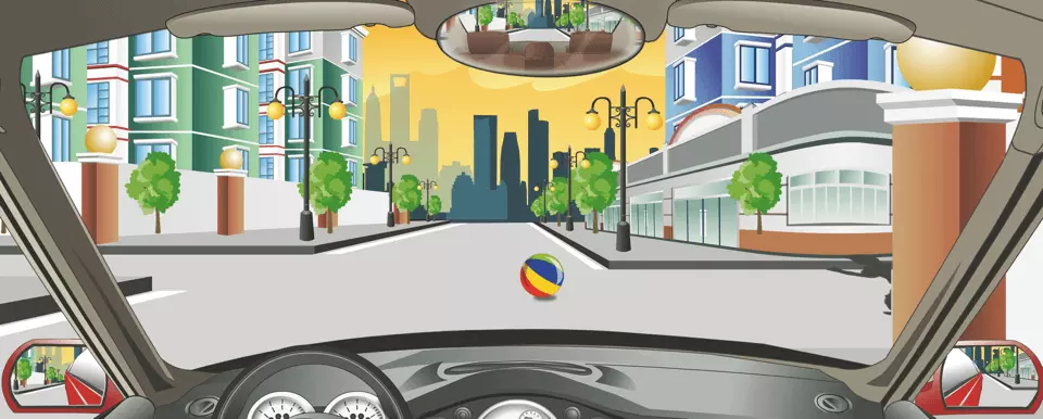 看到前方有皮球,就要联想到可能会有儿童跑出来捡球,而且距离较近,因此要停车避让。