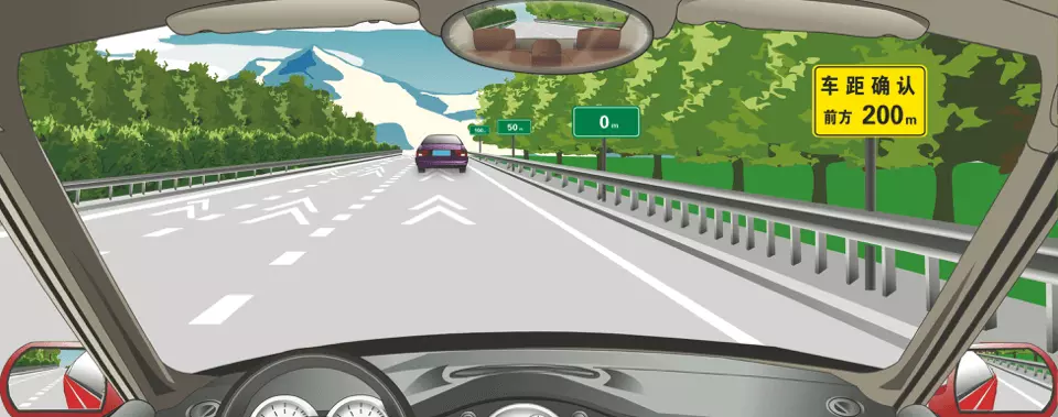 “车距确认”“前方200m”并且路面上的白色折线是车距确认线,右侧标志提示前方200米是车距确认路段。