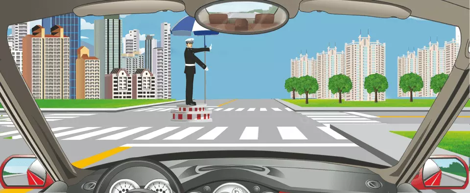 A.直行通过路口 B.靠路边停车 C.进入左弯待转区 D.在路口向右转弯 答案:D。 解析:脸朝哪边就是指挥哪边,手掌心朝哪边就是转向哪边。交警面向我方车道说明此时手势是针对我方车道车辆的,且手势为右转弯手势,因此看到这种手势后应该在路口向右转弯。">