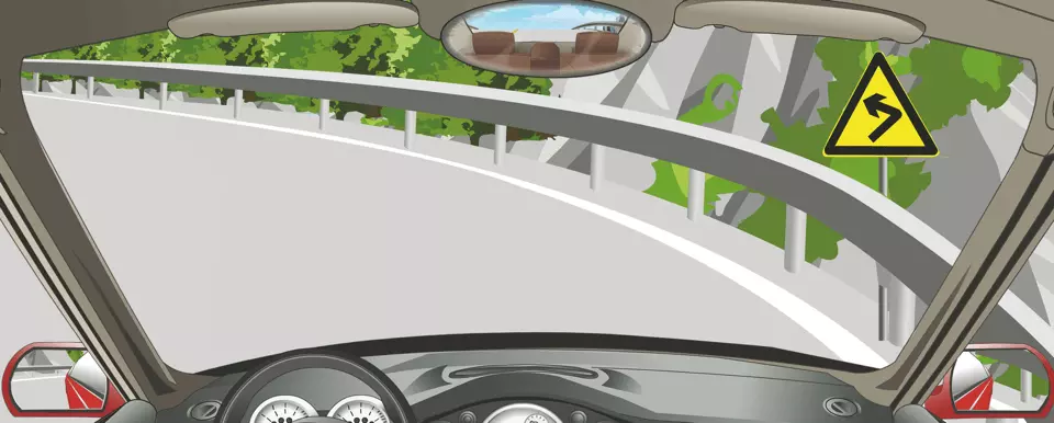 A.占对向车道行驶 B.靠右侧减速行驶 C.在道路中心行驶 D.紧靠路右侧行驶 答案:B。 解析:由图可知,前方是向左急转弯路段,因此为了避免前方有来车,应当减速鸣号靠右行。">