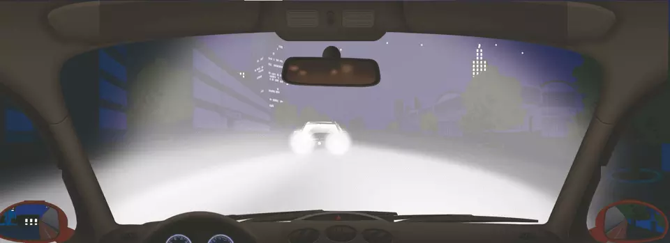 由图可知,对向来车开着远光灯,此时不要意气用事,而是要为了安全考虑,要减速或停车让行,避免会车时发生意外。
