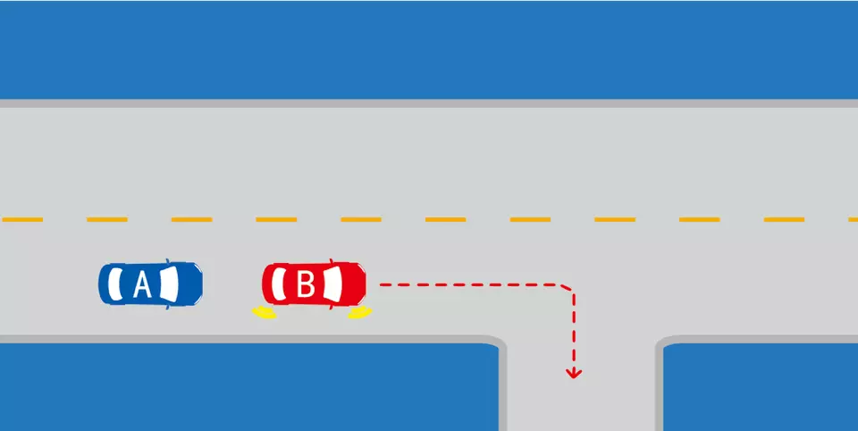 如图所示,A车在B车后,B车开启了右转向灯,减速右转,紧跟B车的A车需要减速,以保持安全距离。