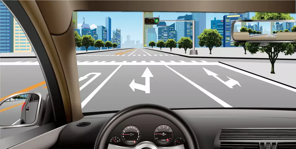 车道上的导向箭头指向左侧和前方,表示左转弯或直行这两种行驶路线。