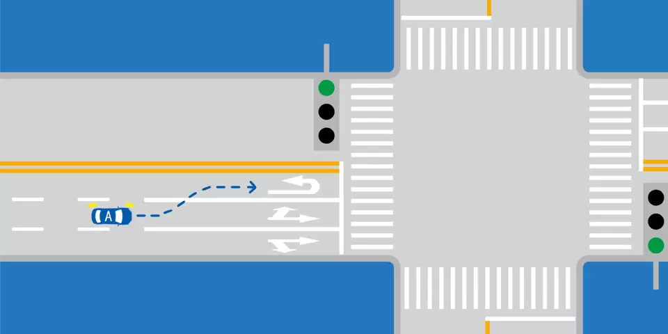 如图所示,A车要在前方掉头行驶,可以在此处变换车道,进入左侧车道准备掉头。