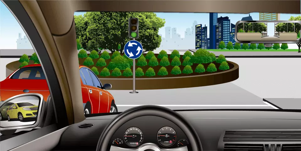 如图所示,在这种情况下准备进入环形路口时,为了保证车后车流的通畅,应加速超越红车进入路口。