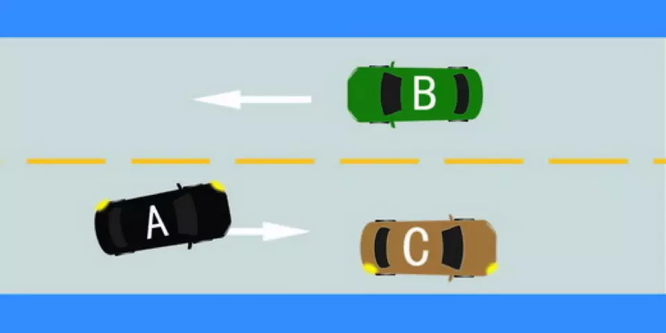 如图所示,驾驶机动车在这种情况下,当C车减速让超车时,A车应该如何行驶?