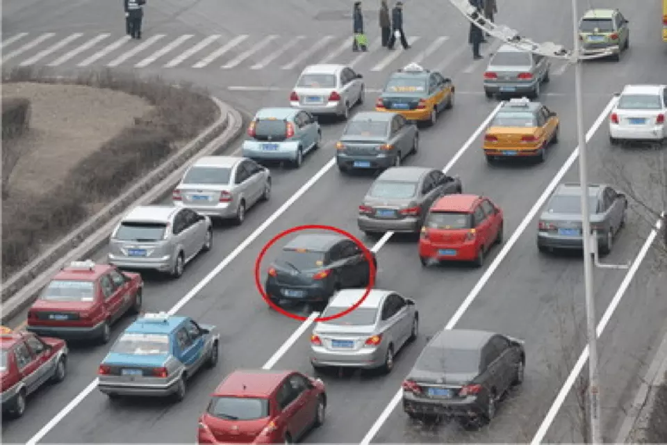 如图所示,红圈标注的深色车辆的做法是违法的。